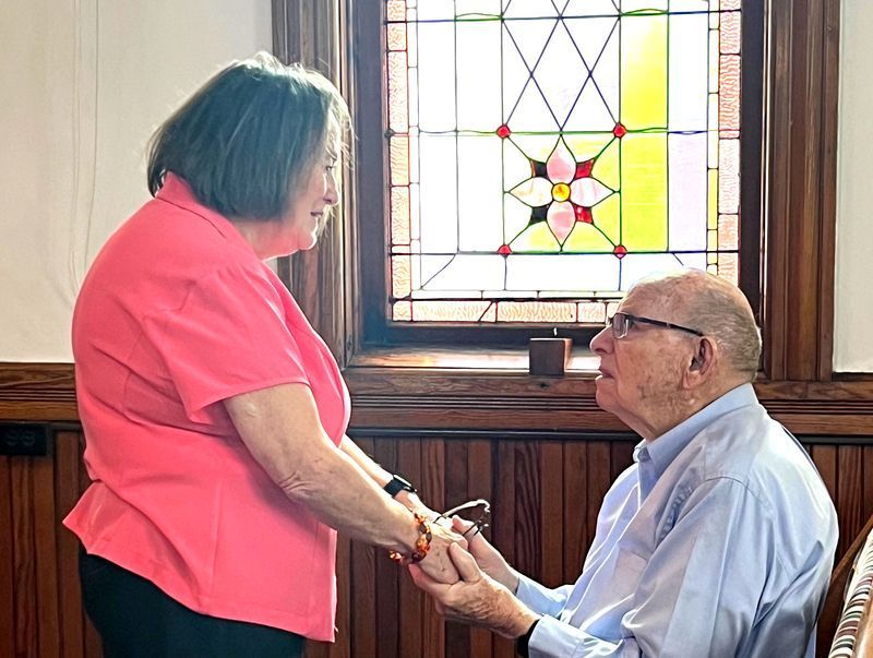 Trish DeMondfort and Gene James share conversation and friendship before church began.